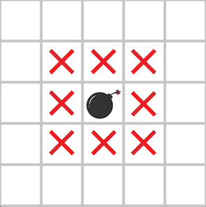 다음 그림과 같이 지뢰가 있는 지역과 지뢰에 인접한 위, 아래, 좌, 우 대각선 칸을 모두 위험지역으로 분류합니다.