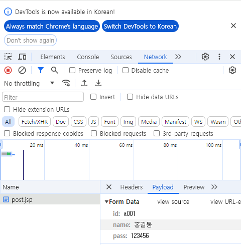<h3>클라이언트가 전송한 데이터(id, password, name)를 받을 때 : request 내장 객체를 이용한다.</h3>