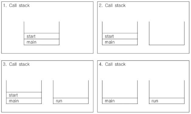 call stack하나 더 생성 > run이라는 메서드를 새로만든 call stack에 생성한 뒤 start가 사라짐