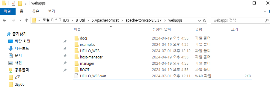 tomcat > webapps에서 war파일 저장하면 자동으로 해당이름의 폴더가 생성되면 배포가 완료