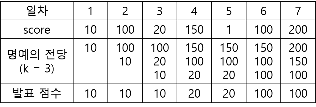 이 프로그램에서는 매일 "명예의 전당"의 최하위 점수를 발표합니다. 예를 들어, k = 3이고, 7일 동안 진행된 가수의 점수가 [10, 100, 20, 150, 1, 100, 200]이라면, 명예의 전당에서 발표된 점수는 아래의 그림과 같이 [10, 10, 10, 20, 20, 100, 100]입니다.