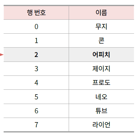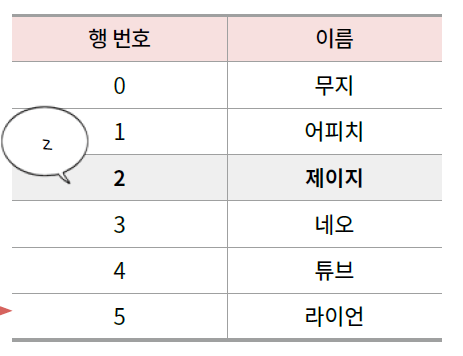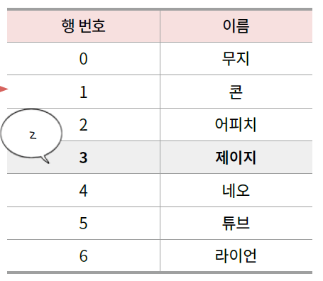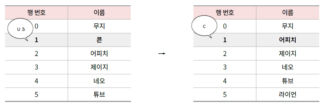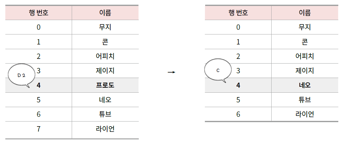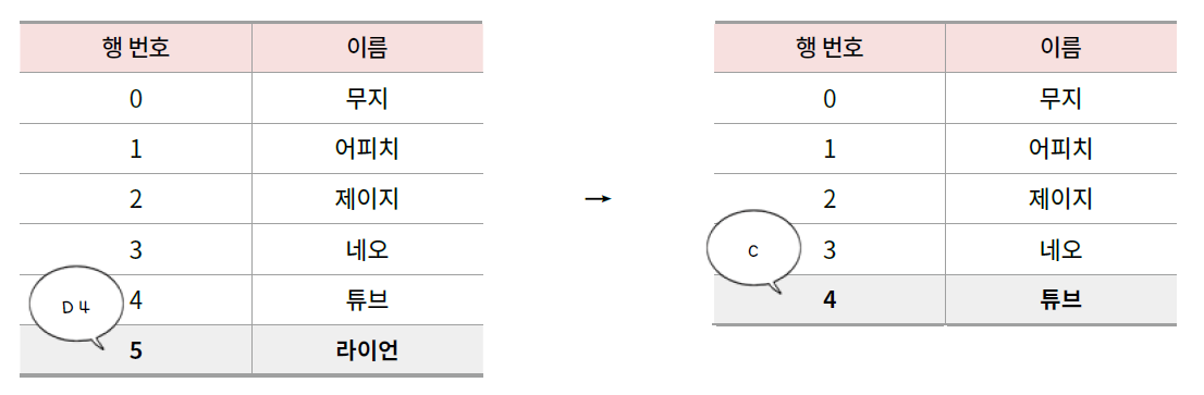 예를 들어 위 표에서 “D 2”를 수행하면 다음 그림의 왼쪽처럼 4행이 선택되며 “C”를 수행하면 선택된 행을 삭제하고 바로 아래 행이었던 “네오”가 적힌 행을 선택합니다.