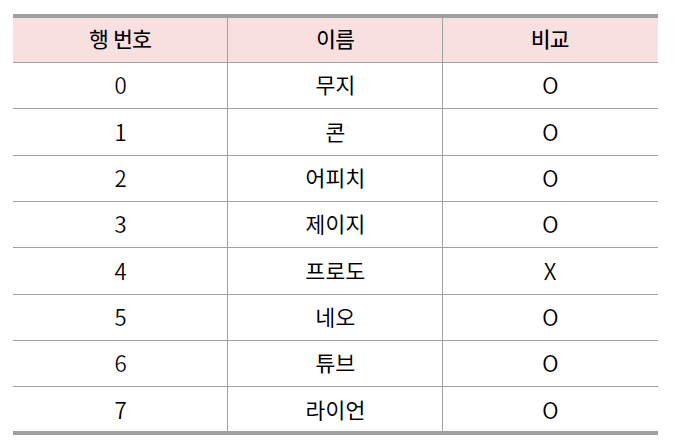 최종 표의 상태와 처음 표의 상태를 비교해 삭제되지 않은 행은 “O”, 삭제된 행은 “X”로 표시하면 다음과 같습니다.