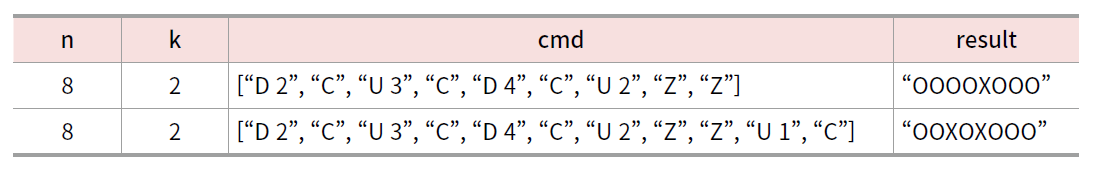처음 표의 행 개수를 나타내는 정수 n, 처음에 선택한 행의 위치를 나타내는 정수 k, 수행한 명령어들이 담긴 문자열 배열 cmd가 주어질 때, 모든 명령어를 수행한 후의 표의 상태와 처음 표의 상태를 비교해 삭제되지 않은 행은 O, 삭제된 행은 X로 표시해 문자열 형태로 반환하는 solution( ) 함수를 완성하세요.